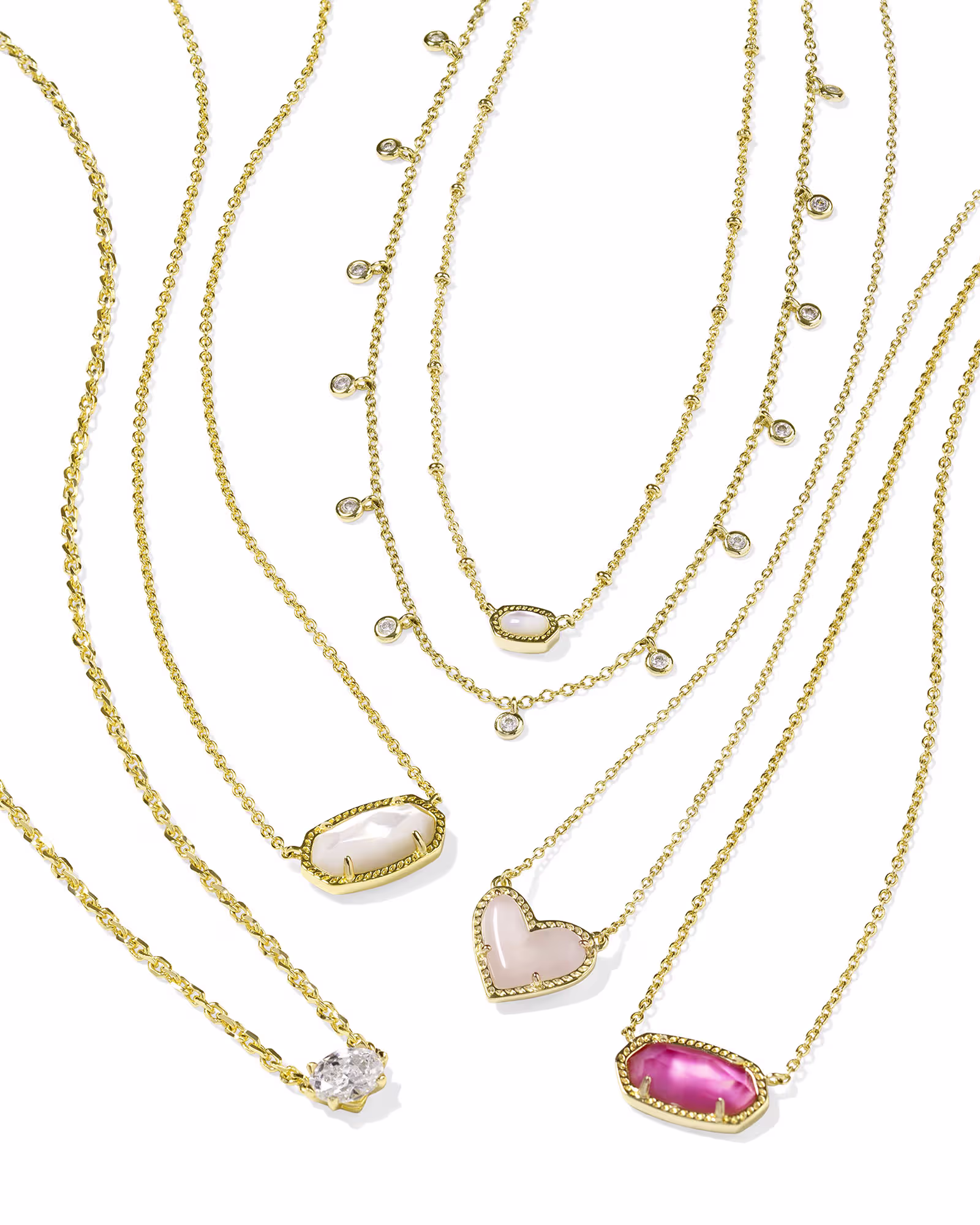 2 Elisa Pendant Necklaces, Mini Elisa Satellite Short Pendant Necklace, Ari Heart Pendant Necklace, Cailin Pendant Necklace, Amelia Chain Necklace, Mini Ellie Stud Earrings, Ari Heart Huggie Earrings, Cailin Huggie Earrings, Mikki Metal Huggie Earrings, Elaina Adjustable Chain Bracelet, and Courtney Paperclip Bracelet in assorted colors
